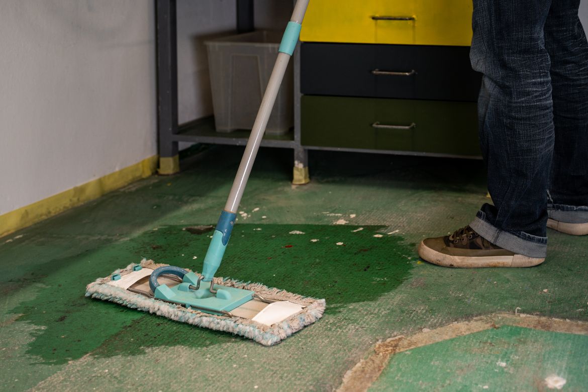 Betonovou podlahu před natíráním důkladně očistěte, omeťte od prachu a nečistot. Nový beton je potřeba nechat dostatečně vyzrát. Starší povrchy zase musí být pevné, soudržné a zbavené starých nepřilnavých nátěrů a mastných skvrn. Na závěr podlahu vytřete a nechte uschnout. Pomocí maskovací pásky zakryjte všechna místa, kterým hrozí zašpinění od barvy (např. okraje stěn, zárubně dveří, zásuvky).